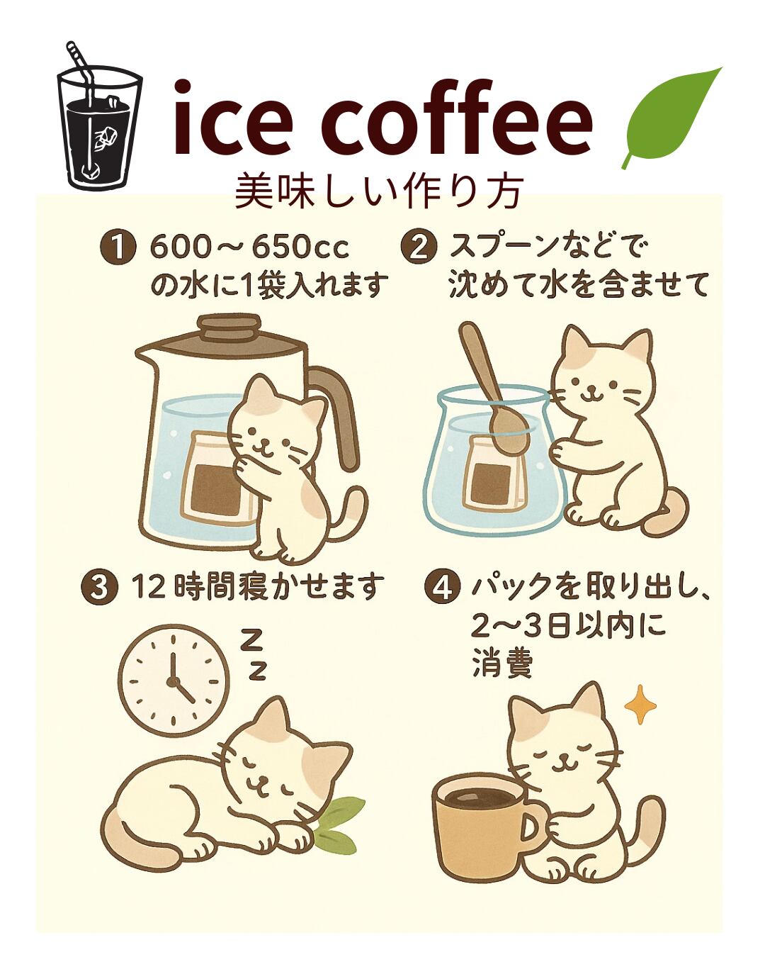 600ccの水に1パックを入れ、冷蔵庫で12時間ほど浸け置くだけのコストパフォーマンスの高いアイスコーヒー