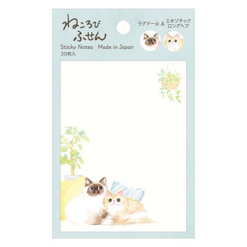 猫カフェの愛くるしいねこを描いた、筆記面がたっぷりある使いやすいふせんです。仲良しの2匹が寄り添い、のんびりと過ごす愛らしい仕草が描かれています。